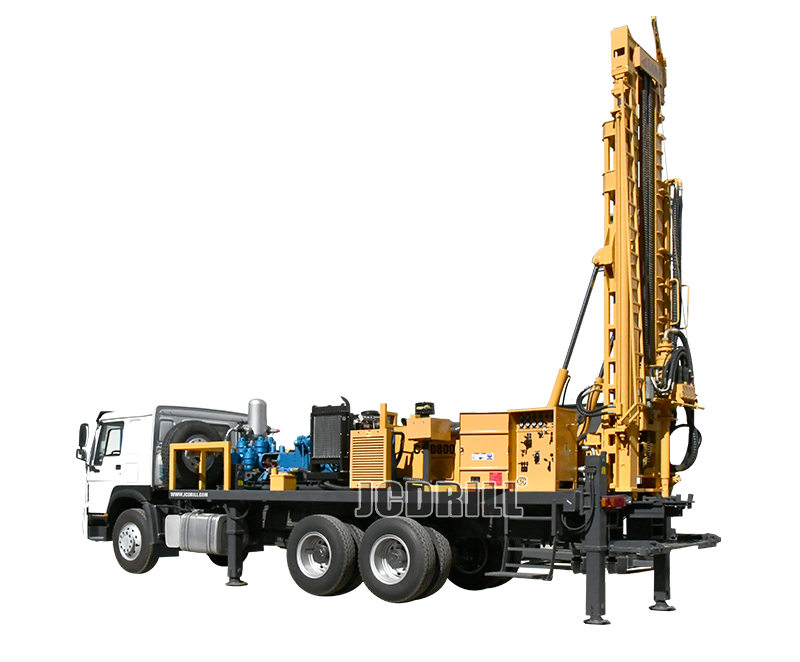 卡车式水井钻机由我们的专业工程师采用先进技术理念设计,是一款液压回转钻机。卡车底盘采用专用起重机底盘,主传动系统、分动箱、变速箱、双绞盘单元、泥浆泵、转盘、钻塔和给进机构均安装在底盘上。该钻机是一款带定向循环的回转钻机,配备泥浆泵,以泥浆作为冲洗液,如配备合适的钻头,可在粘土、沙土和岩石地层中钻进。钻机动力来源于卡车发动机;钻机配有分动器和液压系统。